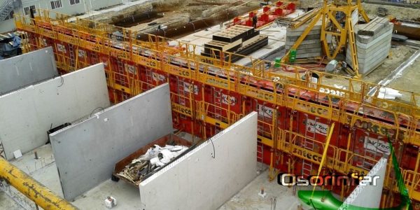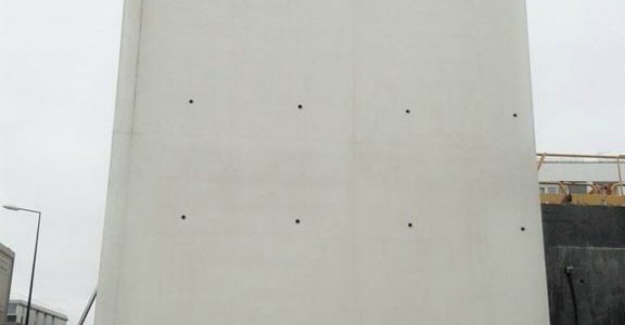 Como os muros eram acabados e tinham de ser betonados a 7,45 m de altura usamos betão autonivelante, o que obrigava a uma perfeita isolação das cofragens e controle da pressão interior dos painéis do momento da betonagem através de utensílios de medição instalados nas tiges. Além do mais para evitar a segregação do betão na descida, foram utilizados tubos de betonagem dentro dos muros nos diferentes pontos de betonagem